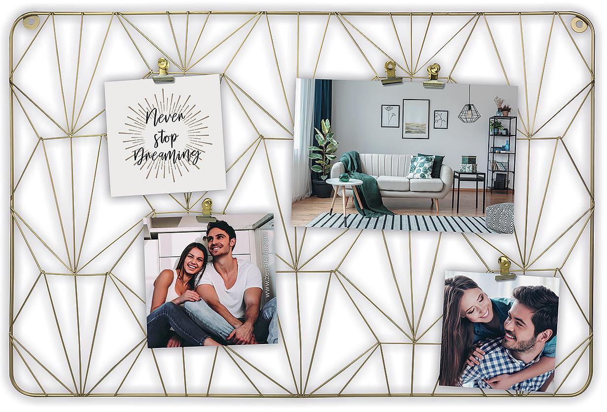 Collagelijst ontworpen als een prikbord waar je je foto's met klemmen vast maakt. De lijst is gemaakt van metaal en heeft een mooie gouden kleur. Omdat je je foto’s in de klemmen plaatst, kun je ervoor kiezen om verschillende formaten te mixen en bijvoorbeeld kleinere posters of leuke notities bij te voegen. Laat je creativiteit de vrije loop! De lijst meet 62x41 cm in buitenmaten en heeft wandbevestiging. Deze collagefotolijst past goed boven het bureau, in de keuken of elders waar het tot zijn decoratieve en functionele recht komt.