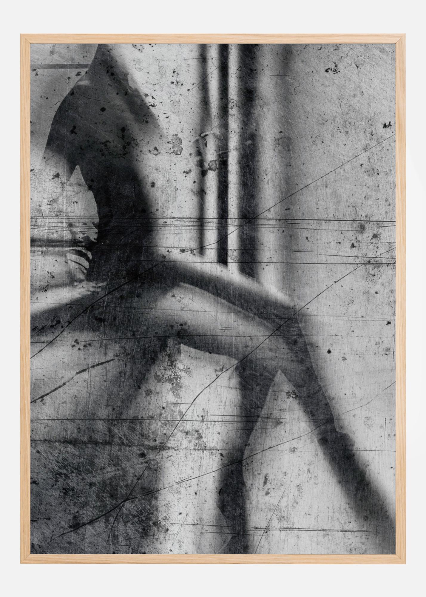 Een abstracte poster van een vrouw die op een muur zit. De zwart-wit poster omvat lijnen en zachte randen om een artistiek, impressionistisch beeld te creëren. Voeg deze poster toe aan een witte muur voor een dramatische look, of combineer met een gedurfde kleur voor meer drama.