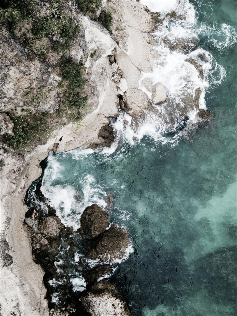 Een luchtposter van de zee met de golven die tegen de rotsen beuken. Geniet van de schoonheid van deze foto terwijl je de kristalblauwe zee ziet die tegen de met algen begroeide rotsen beukt. De schoonheid van deze poster laat je bijna de frisheid in de lucht ruiken.