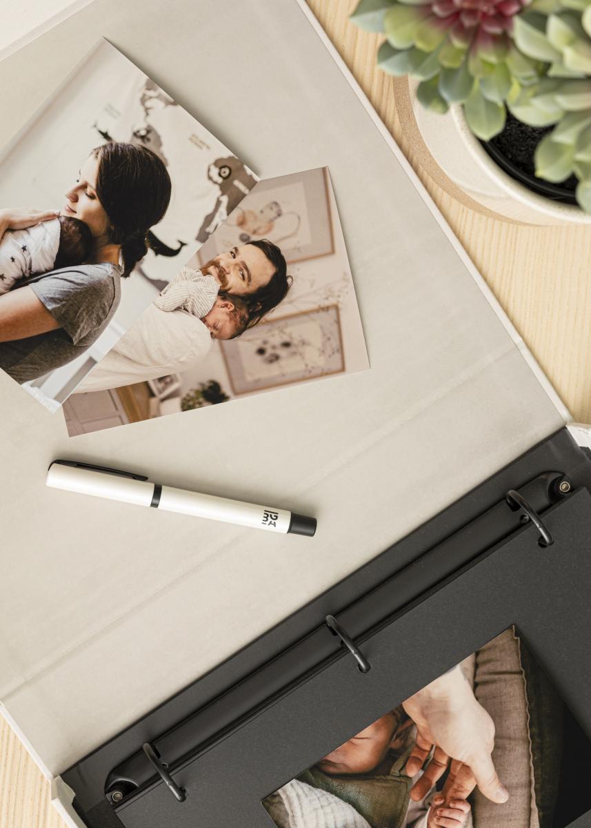 Het fotoalbum is ontworpen als een exclusief boek die je opent om toegang te krijgen tot de inhoud. In het album zit een ringband met 30 zwarte vellen (60 pagina's) om je favoriete herinneringen mee te vullen. Je plakt je foto's zelf, wat je alle ruimte en mogelijkheid biedt om je creatieve kant naar buiten te laten komen.