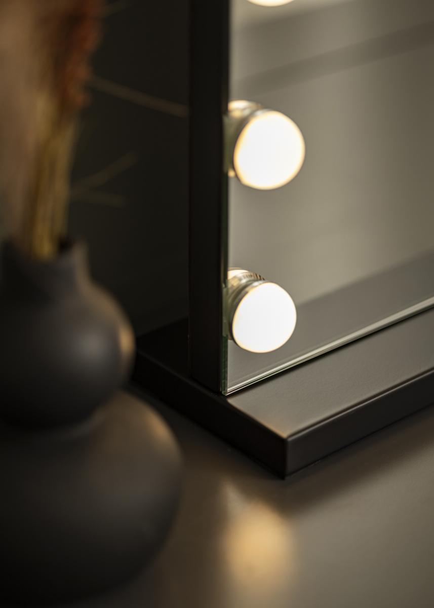 Verander een kamer in een make-up studio met deze luxe make-up spiegel in Hollywood-stijl van KAILA! Dit is een grote make-up spiegel in zwarte kleur met geïntegreerde verlichting in de vorm van 14 LED-gloeilampen die het grote spiegeloppervlak mooi omlijsten. De LED-verlichting is dimbaar en heeft een warm wit licht in 3000K. De verlichting zet je eenvoudig aan door op de aanraakknop te drukken en de helderheid pas je eenvoudig aan door de knop ingedrukt te houden. De spiegel meet 50x45 cm.
