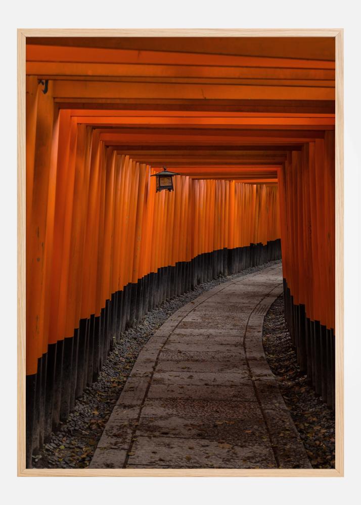 Een poster van een stenen pad omzoomd met oranje en zwarte houten bonen. In het midden van het pad hangt een ijzeren lantaarn. Het natuurlijke licht schijnt op het pad waar enkele kleine herfstbladeren zijn gevallen. Een prachtige poster om elke muur op te fleuren.