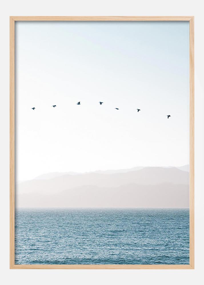 Een prachtige natuurfotografie van vogels die over blauw water zweven tegen een achtergrond van verre bergen en een witte hemel. Een rustige en harmonieuze poster in verkoelende tinten die net zo goed past in de badkamer als in de slaapkamer of woonkamer.