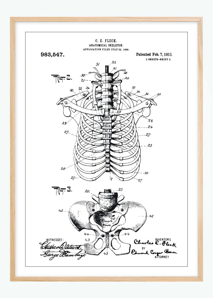 Deze patentposter presenteert een gedetailleerde illustratie van een anatomische skeletconstructie, gepatenteerd door C.E. Fleck op 7 februari 1911, onder patentnummer 983,547. De tekening, die op 23 juli 1909 werd ingediend, benadrukt de opbouw van het skelet en de mechanische verbindingen, specifiek hoe de ribben en de ruggengraat zijn geconstrueerd om de menselijke anatomie nauwkeurig en educatief weer te geven.