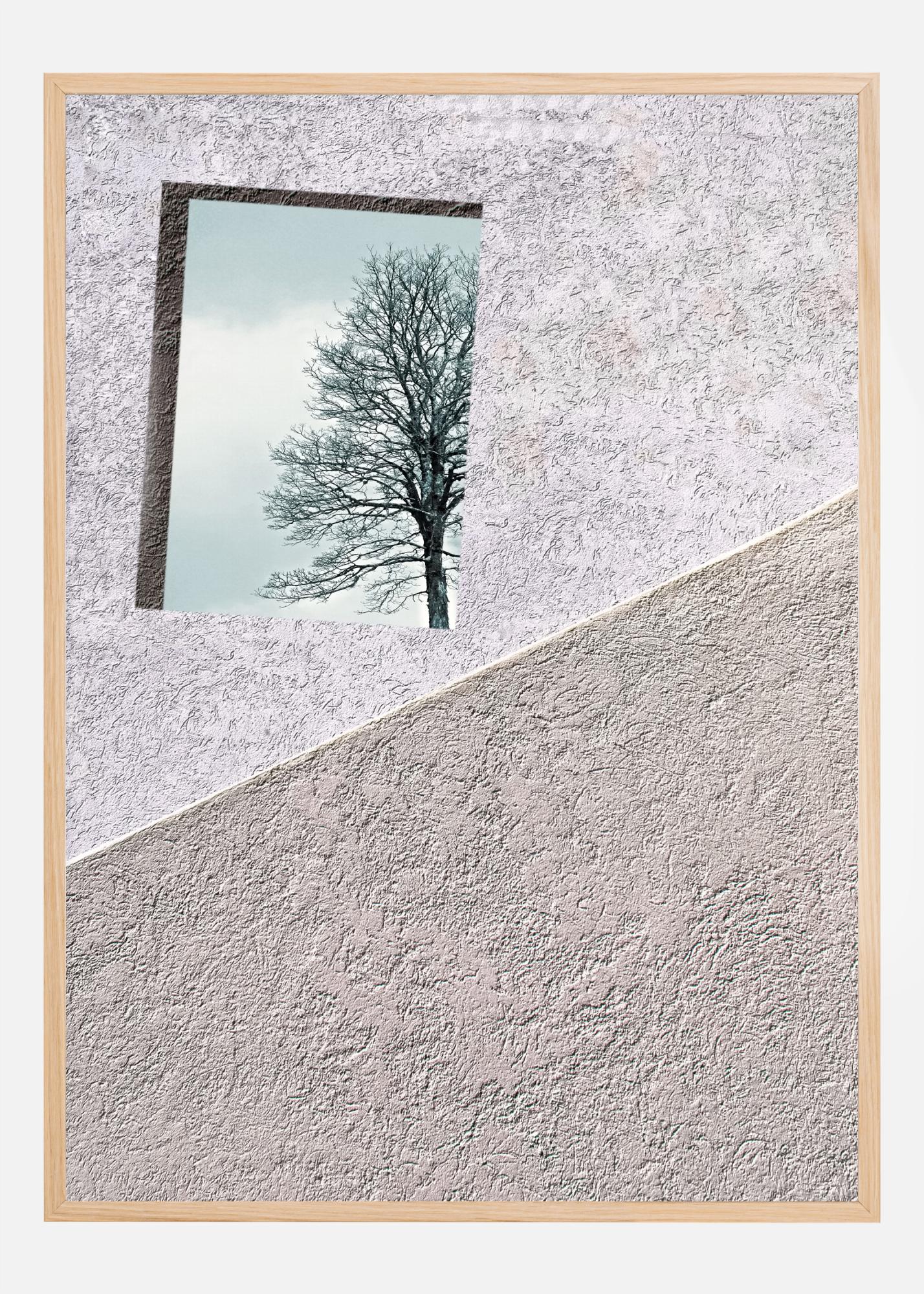 Een delicate poster van een roze en bruine muur. De ruw bepleisterde muur is in twee delen verdeeld. Aan de roze kant van de muur zie je een bewolkte blauwe lucht met een boom op de voorgrond, terwijl de bruine muur kaal is. Een creatieve poster voor elk modern huis.