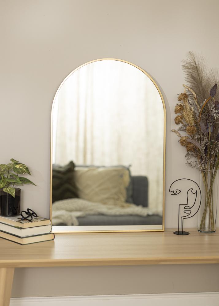 Dit is een moderne wandspiegel die in elke kamer kan worden gebruikt. Je kunt de spiegel een trendy detail laten zijn in je slaapkamer of woonkamer, of het gebruiken als een badkamerspiegel of halspiegel om je goed te kunnen weerspiegelen als je je klaarmaakt voor de dag. De spiegel heeft een 28 mm diep metalen frame, met een exclusieve goudkleur die de spiegel een prachtige afwerking geeft. De stijlvolle op een boog geïnspireerde vorm versterkt de luxe uitstraling.